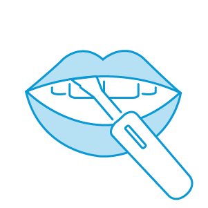 Abre la boca y pasa la almohadilla de la paleta entre tu encía y labio interior superior de derecha a izquierda, de manera firme y solo una vez tal como lo muestra la imágen. Luego haz lo mismo a lo largo de la encía y labio de abajo.
